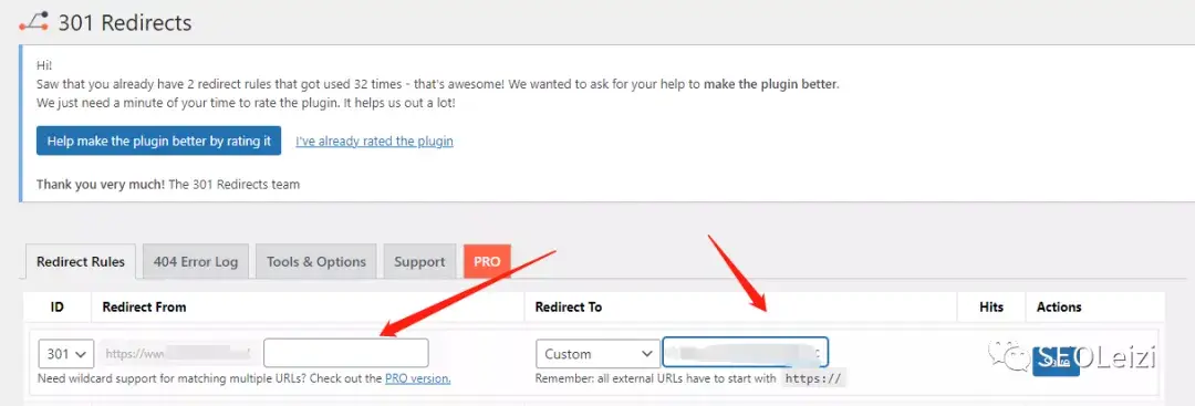 下方左侧是你想要进行301重定向的URL,也可以说是你的旧链接,右侧则是你想要转移给的URL,也就是你的新链接,当你把链接设定好以后,点击右侧的“Save”便可以了。