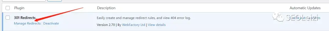 回到Plugins,找到“301 Redirect”,然后点击“Manage Redirects”进入编辑301重定向。