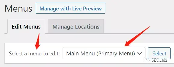 在“Select a menu to edit” 中找到 “Main Menu (Primary Menu)”,点击“Select”。