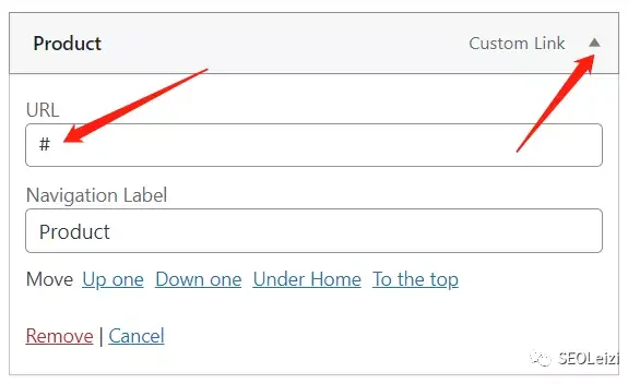 点击左侧的“Custom Links”,在URL处写上“#”,在Link Text处写上“Product”,然后点击“Add to Menu”添加至导航。