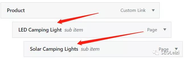 将页面滑到最低下找到我们新添加的“Product”导航,将其拖拽导航的最上方,然后根据你之前设定好的“Product”导航内容将下面二级,三级导航内容拖拽到“Product”的后下方。
