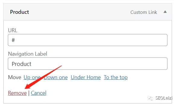 点击一级导航“Product”,点击下方的“Remove”,将原本的一级导航给删除。