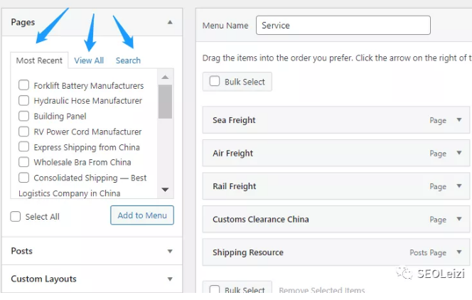 在左侧的“Pages”里, “Most Recent”中会给出你常用的某些页面; “View All”则是会将你的网站所有页面呈现在这里; “Search”则可以允许你通过文字搜索来查找你想要找的页面。