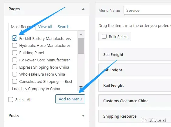当你确定好哪些页面要添加进导航后,你可以直接点击前面的方框,然后点击下面的“Add to Menu“,这样就可以直接将这个页面的链接添加进导航的最下方了。你甚至可以自己自定义一个导航链接,具体的做法请看:如何制作纯文本的Product导航栏