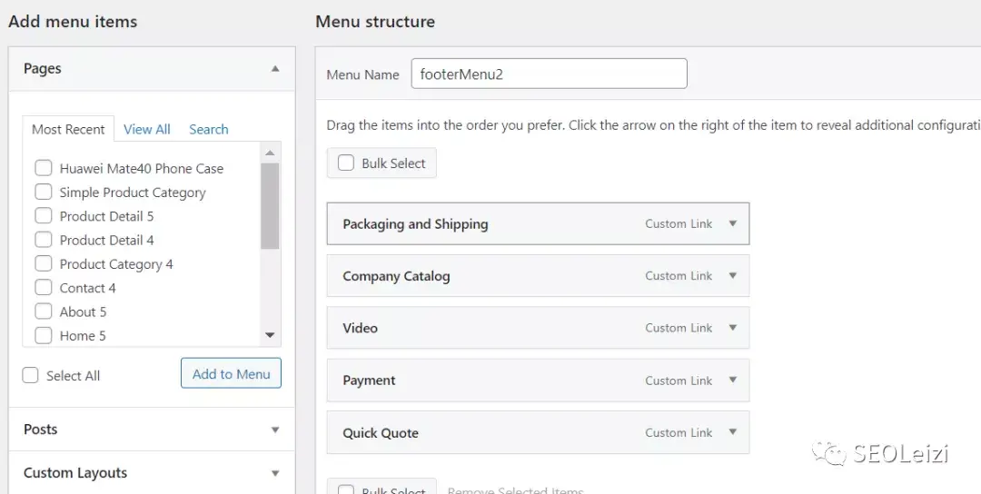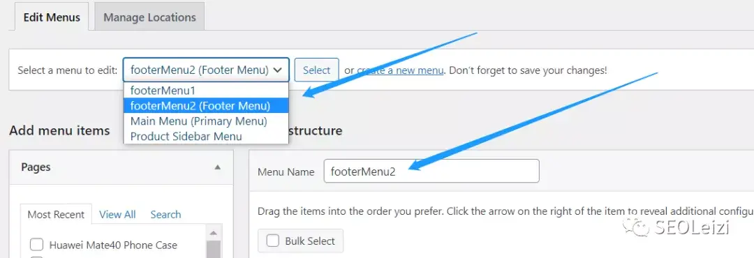 底部导航栏的步骤跟顶部导航栏大同小异,同样是来到“Appearance > Menu”,在“Select a Menu to Edit”里找到“Foot Menu 1”和 “Footer Menu 2”。
