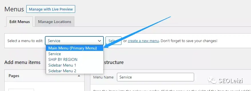 Menu里的“Select a Menu to Edit”中,找到“Main Menu”,然后点击右侧的“Select”。