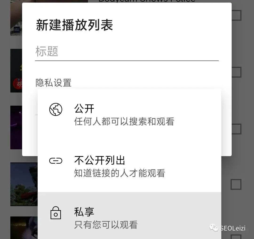 当你点击“下一步”后,就会让你定义你的播放列表的标题和公开范围,选好点击“创建”就会生成你的播放列表了;