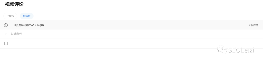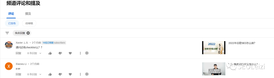 和单个视频的内容不同,工作室里的评论掌管所有视频的评论内容,你在这个模板你可以看到所有的已发布和待审核的视频,同时除开评论以外,还多出了一个“提及”的选项;