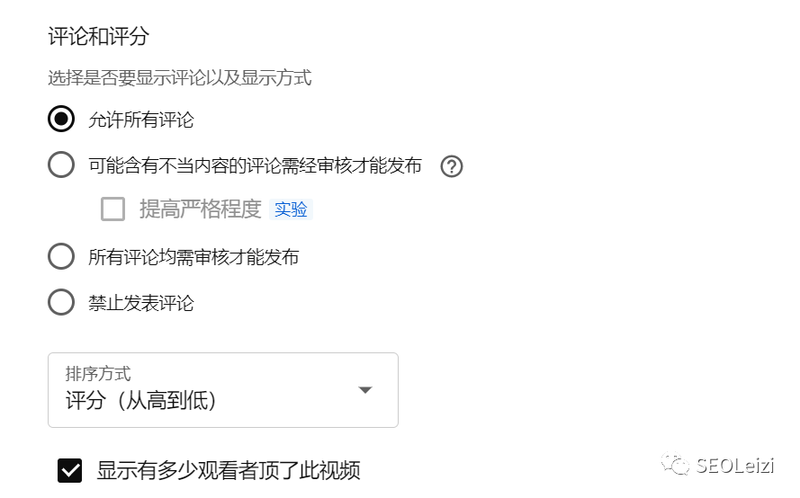 上面我们提到了“审核机制”,是在你上传视频时以及在Youtube工作室的设置->默认上传设置->高级设置中来进行设置的。在这里你可以选择允许所有评论,也可以选择需要审核评论,以及禁止发表评论(不建议选择这个,Youtube鼓励观众与创作者互动,因此禁止评论的话就会影响这一结果);