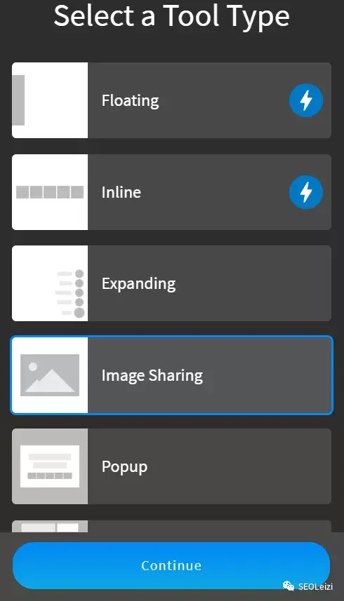 这里有七种风格的分享按钮样式,你可以点击它们然后在右侧查看效果,选择好你想要的样式后,点击下方的“Continue”。