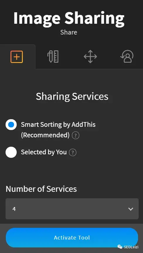 来到模板的编辑页面,你可以在这个页面中编辑你分享链接的数量、颜色、大小和出现在哪些页面。一般而言,你的分享按钮应该放在你的文章页面,这样可以方便你的文案在其他平台分享,如果没有特殊需要,产品页一般不建议放置分享按钮的。编辑结束之后点击“Activate Tool”。