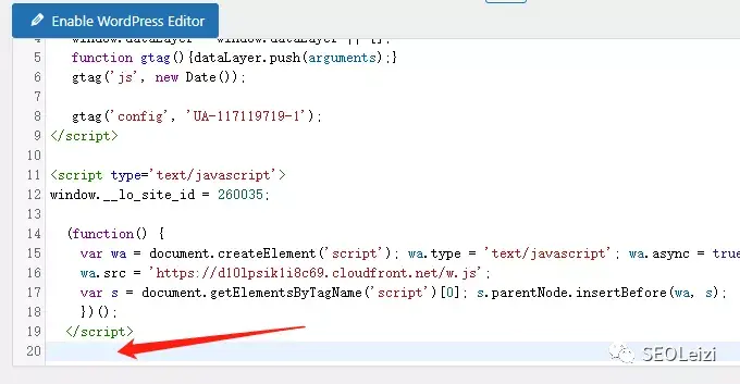 来到你的网站后台,找到Appearance > Custom Layouts > GA Code,并点击“Edit”(如果网站模板不是Leizi老师的,那么粘贴Code的过程会有些许的出入,但大体上都是相通的)。