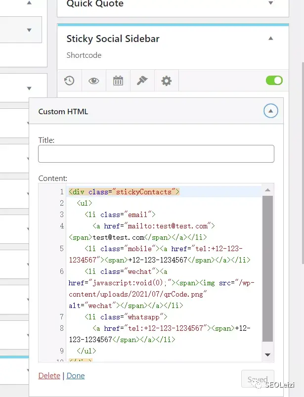 然后回到刚刚的Sticky Social Sidebar,找红色的Wechat,然后将刚刚复制的内容粘贴在“src=”后的红色引号之间(覆盖掉原本的内容);而What’s App的信息填写就和上述的手机号码填写一致了,将号码复制粘贴在红色引号内以及覆盖掉后方的黑色号码即可。