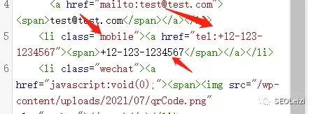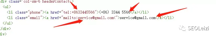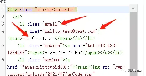 找到红色的”email“,再看向其后方的红色的”mailto:test@test.com“,以及黑色的”sales@test.com“,将红色的”mailto:“后方的邮件地址更改为你的邮箱,同时将黑色的邮箱地址也更改为你的邮件地址。(由于此处的内容是纯代码,因此在我们不懂代码的情况下,我们最好先将这些内容复制并粘贴到其他地方进行保存以免之后我们更改时发生错误无法还原之前的代码。)
